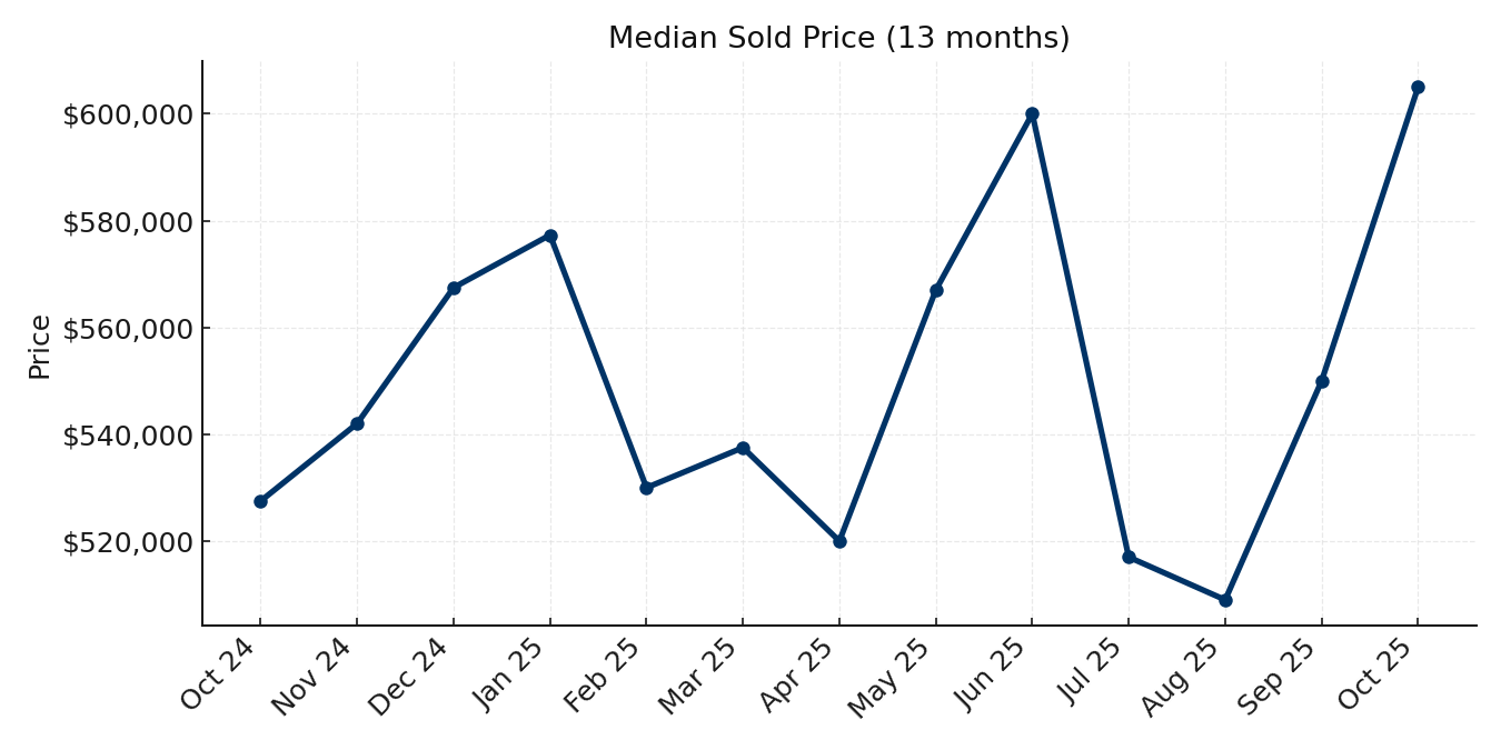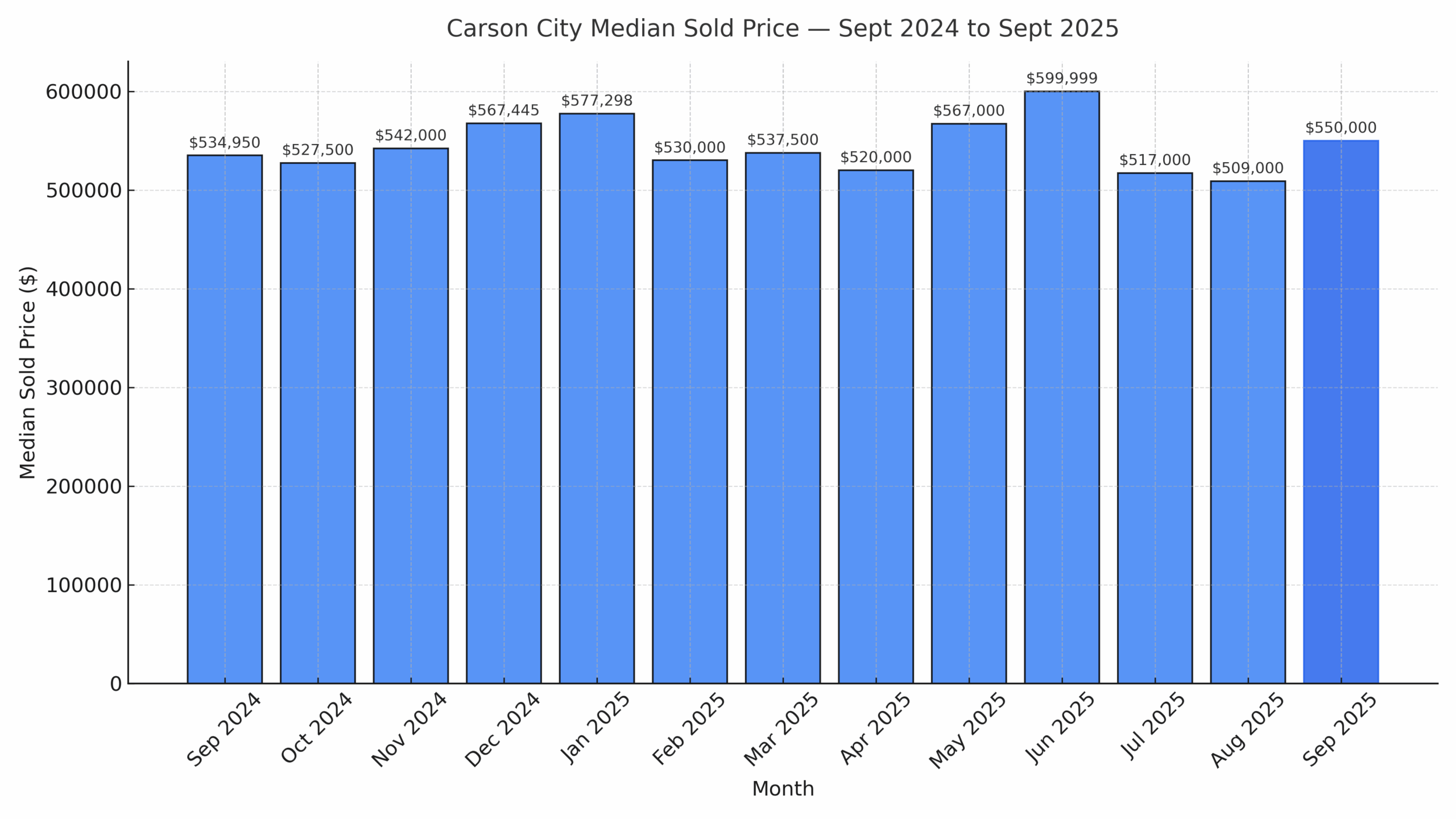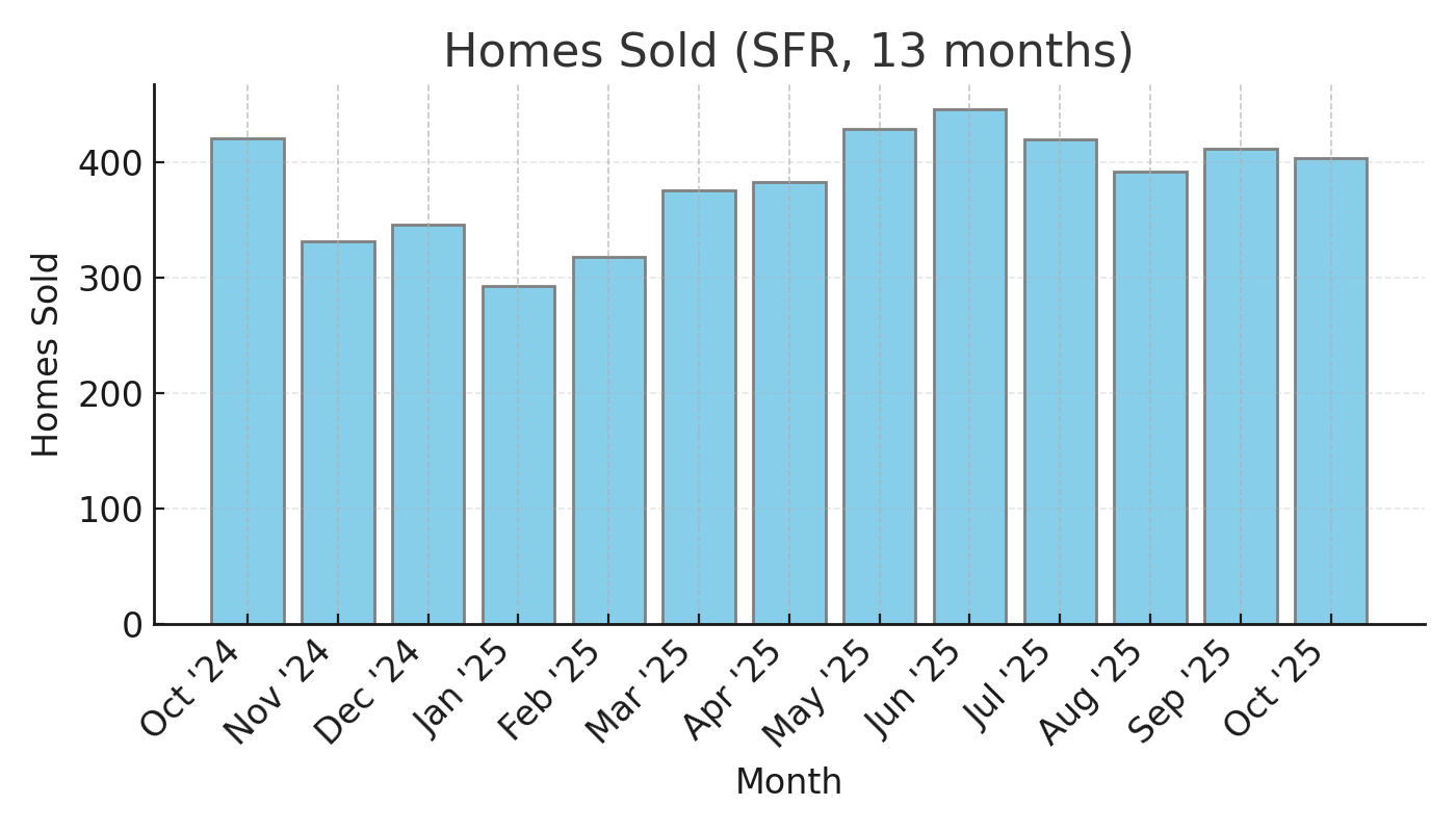 Data: NNRMLS via FlexMLS as of October 13, 2025. Key Metrics (Single-Family Homes, Carson City) Closed Sales: 63 (↑ 14.5% MoM, ↑ 6.8% YoY) Median